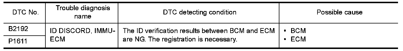 ECM prevents the engine from starting if the ID is not registered. BCM starts the communication with ECM if ignition switch is turned ON.