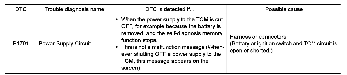 When the power supply to the TCM is cut OFF, for example because the battery is removed, and the self-diagnosis memory function stops, malfunction is detected.