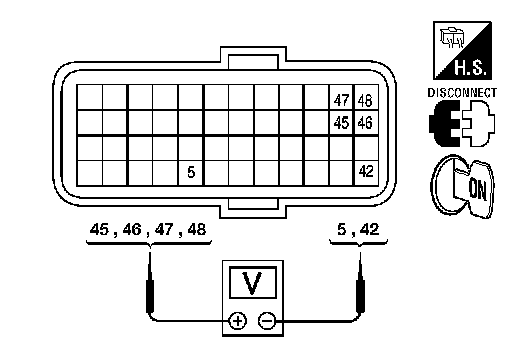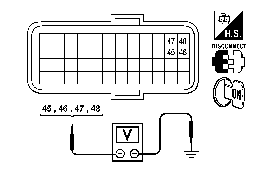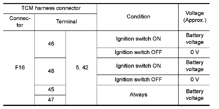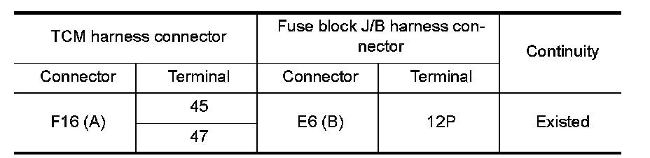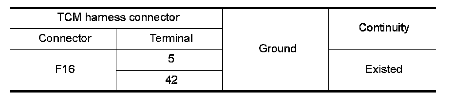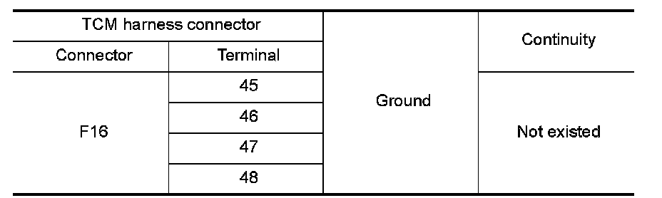 Check continuity between TCM harness connector F16 terminal 45, 46, 47, 48 and ground.