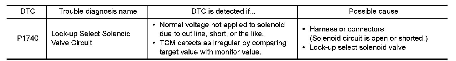 Check lock-up select solenoid valve. Refer to "Component Inspection (Lock-up Select Solenoid Valve)".