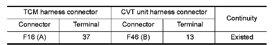 2.Check continuity between TCM harness connector F16 (A) terminal 37 and CVT unit harness connector F46 (B) terminal 13.