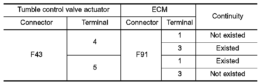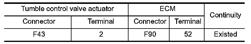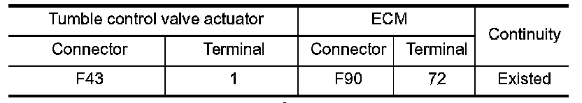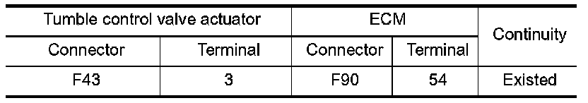 1.Check the continuity between tumble control valve actuator harness connector and ECM harness connector.