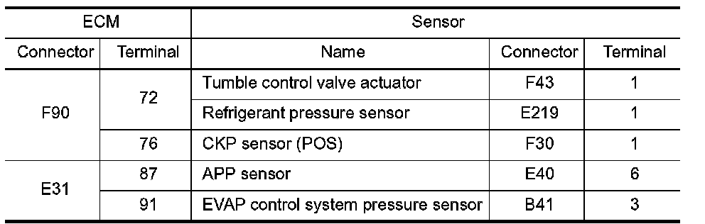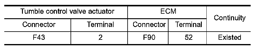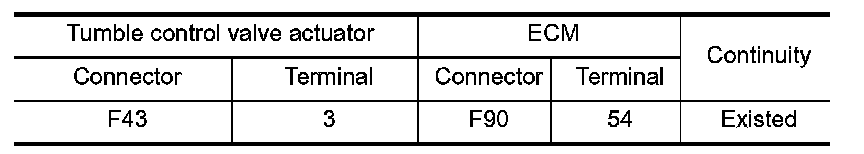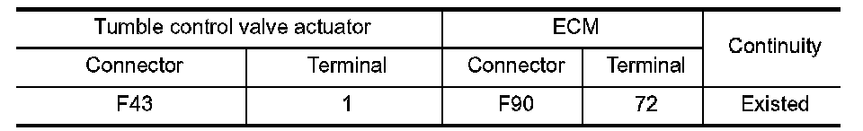 1.Check the continuity between tumble control valve actuator harness connector and ECM harness connector.