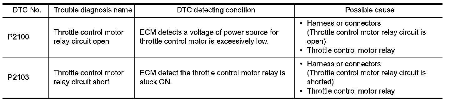 Power supply for the throttle control motor is provided to the ECM via throttle control motor relay. The throttle control motor relay is ON/OFF controlled by the ECM. When the ignition switch is turned ON, the ECM sends an ON signal to throttle control motor relay and battery voltage is provided to the ECM. When the ignition switch is turned OFF, the ECM sends an OFF signal to throttle control motor relay and battery voltage is not provided to the ECM.