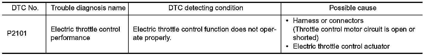 If DTC P2101 is displayed with DTC P2100 or P2119, first perform the trouble diagnosis for DTC P2100 or P2119. Throttle Control Motor Relay For USA And Canada or Electric Throttle Control Actuator For USA And Canada.