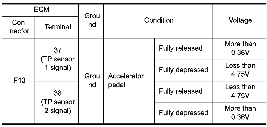 The throttle position sensor has two sensors. These sensors are a kind of potentiometers which transform the throttle valve position into output voltage, and emit the voltage signal to the ECM. In addition, these sensors detect the opening and closing speed of the throttle valve and feed the voltage signals to the ECM. The ECM judges the current opening angle of the throttle valve from these signals and the ECM controls the throttle control motor to make the throttle valve opening angle properly in response to driving condition.