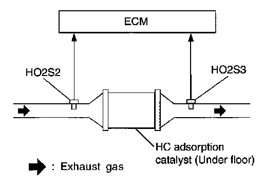 When the phase gap between heated oxygen sensor 2 signal and heated oxygen sensor 3 signal approaches a specified limit value, the HC adsorption catalyst (under floor) malfunction is diagnosed.