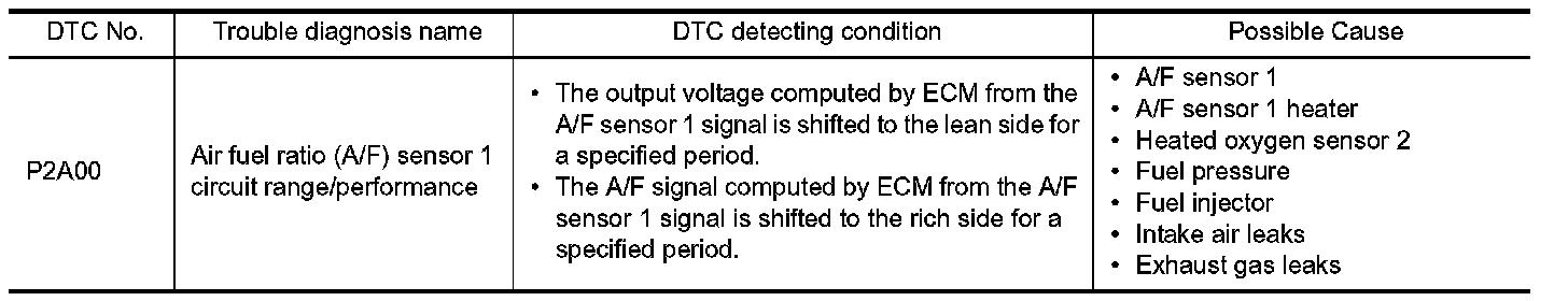 To judge the malfunction, the A/F signal computed by ECM from the A/F sensor 1 signal is monitored not to be shifted to LEAN side or RICH side.