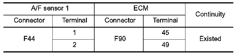 3.Check the continuity between A/F sensor 1 harness connector and ECM harness connector.