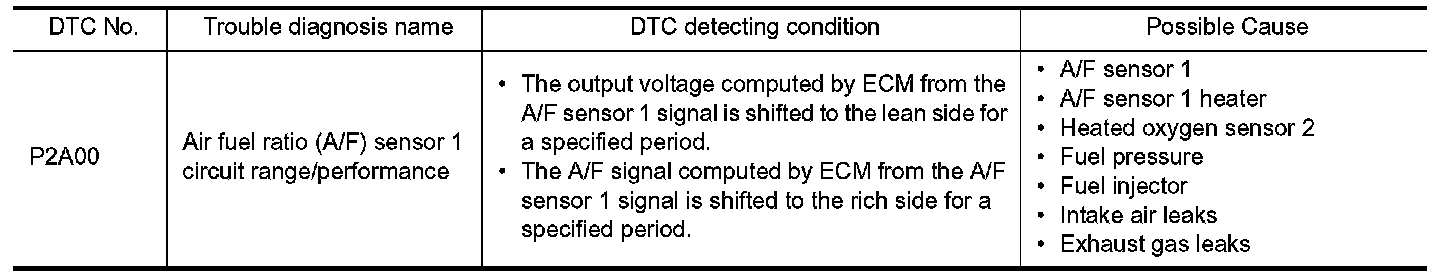 To judge the malfunction, the A/F signal computed by ECM from the A/F sensor 1 signal is monitored not to be shifted to LEAN side or RICH side.