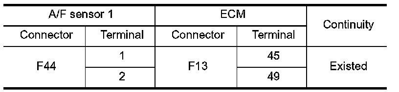 3.Check the continuity between A/F sensor 1 harness connector and ECM harness connector.