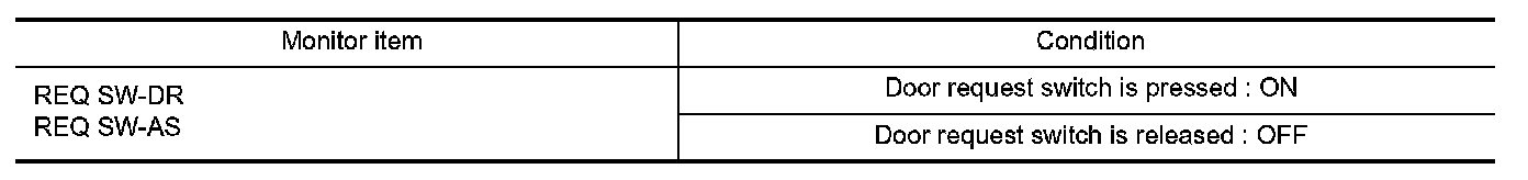 Check door request switch REQ SW-DR, REQ SW-AS in Data Monitor mode.