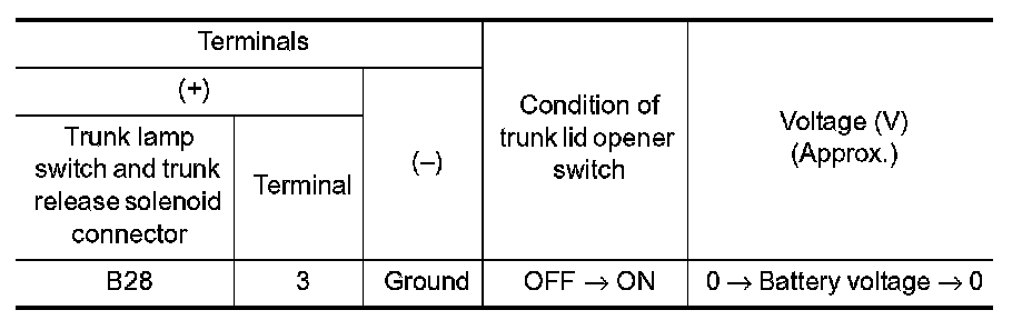 3.Check voltage between trunk lamp switch and trunk release solenoid connector and ground.