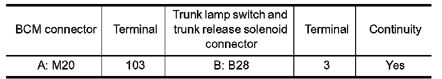 2.Check continuity between BCM connector and trunk lamp switch and trunk release solenoid connector.