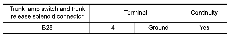 Check continuity between trunk lamp switch and trunk release solenoid connector and ground.