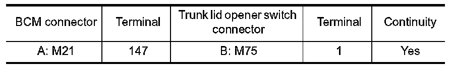 2.Check continuity between BCM connector and trunk lid opener switch connector.