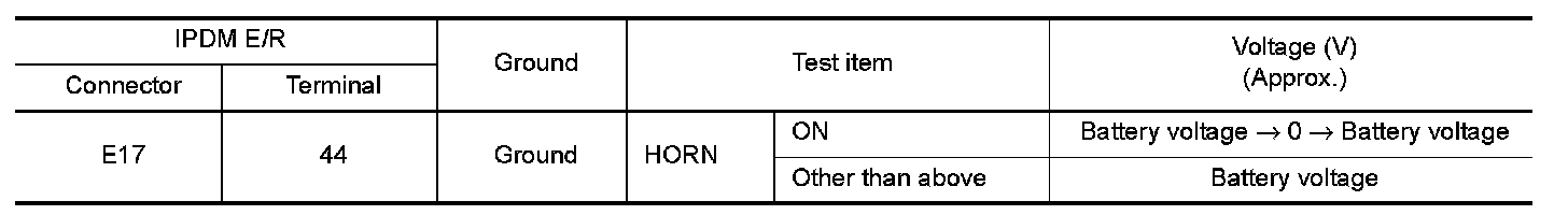 3.Using an analog voltmeter or an oscilloscope, check voltage between IPDM E/R connector E17 terminal 44 and ground.