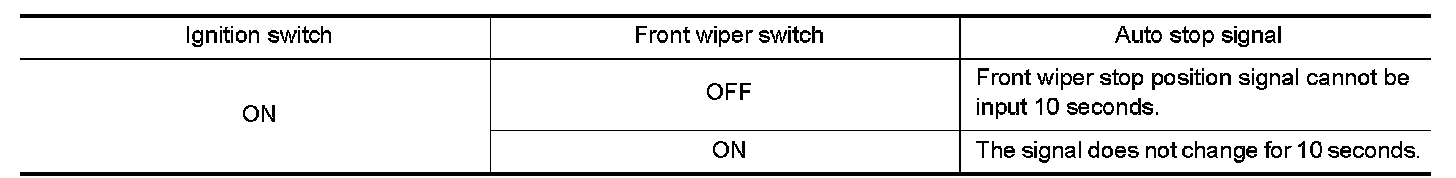 When a front wiper auto stop signal is in the conditions listed below, IPDM E/R stops power supply to wiper after repeating a front wiper 10 second activation and 20 second stop five times.