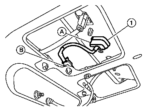 - For sedan models, disconnect the rear view camera connector (B), press the rear view camera tab (A) and remove the rear view camera (1).