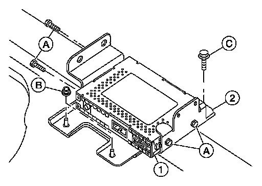 7.Remove the satellite radio tuner screws (A) and remove satellite radio tuner (1) from the bracket (2).