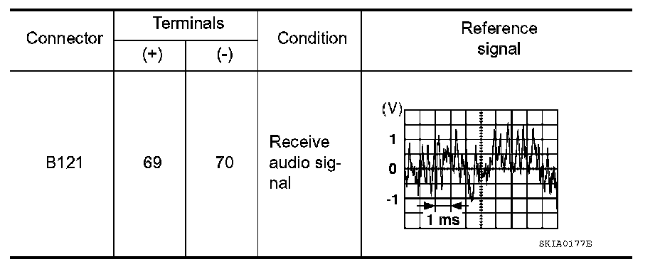 4.Check the signal between BOSE speaker amp. harness connector B121 terminals with CONSULT or oscilloscope.