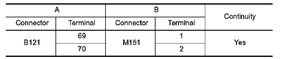 2.Check continuity between BOSE speaker amp. harness connector B121 (A) and center speaker harness connector M151 (B).