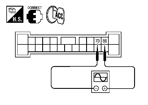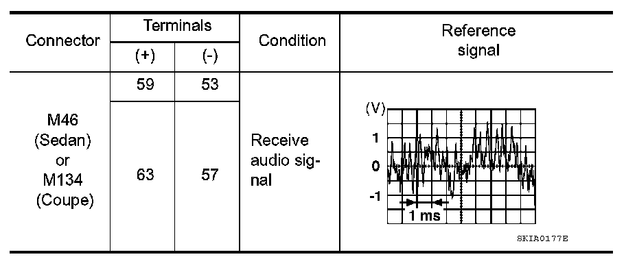 4.Check the signal between audio unit harness connector M46 (Sedan) or M134 (Coupe) terminals with