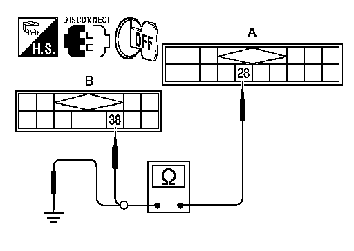 3.Check continuity between satellite radio tuner (factory installed) harness connector B123 (A) terminal 28 and audio unit harness connector M117 (B) terminal 38.
