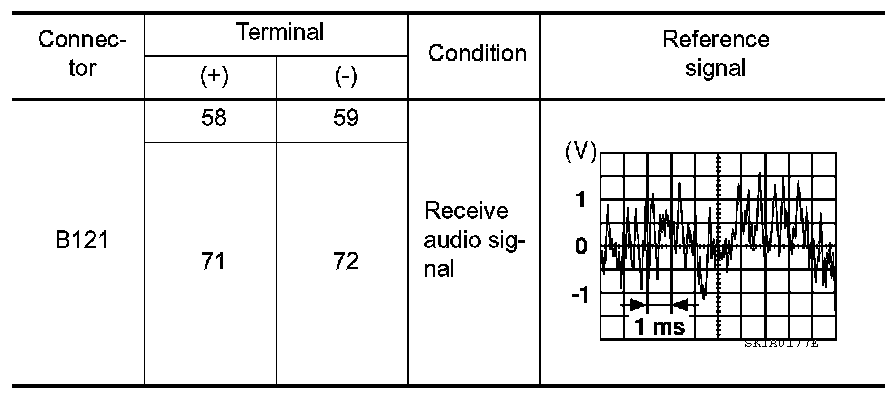 4.Check the signal between BOSE speaker amp. harness connector B121 terminals with CONSULT or oscilloscope.