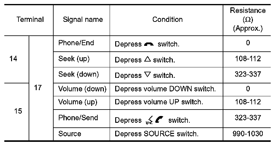 When one of the steering wheel audio control switches is pushed, the resistance in steering switch circuit changes depending on which button is pushed.