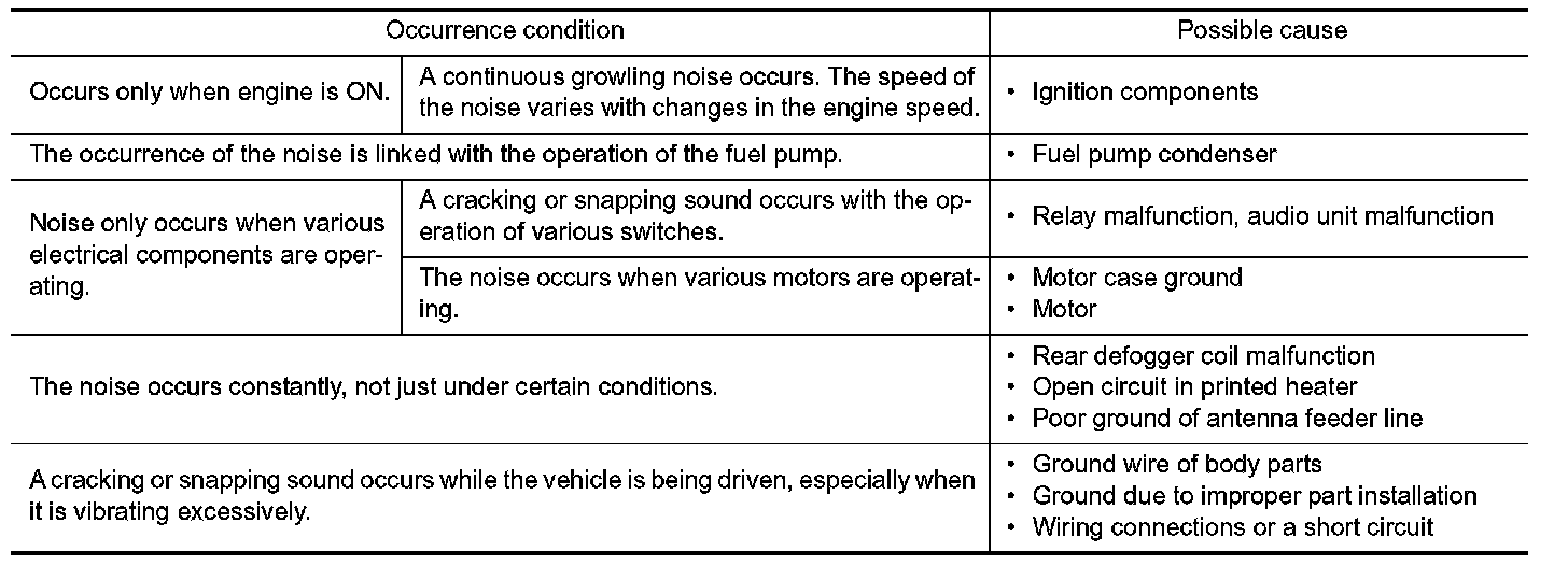 The vehicle itself can be a source of noise if noise prevention parts or electrical equipment is malfunctioning.
