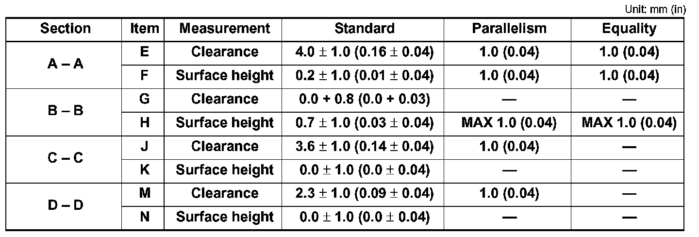 8.Adjust the clearance (M) and surface height (N) between the front fender and the body side outer.