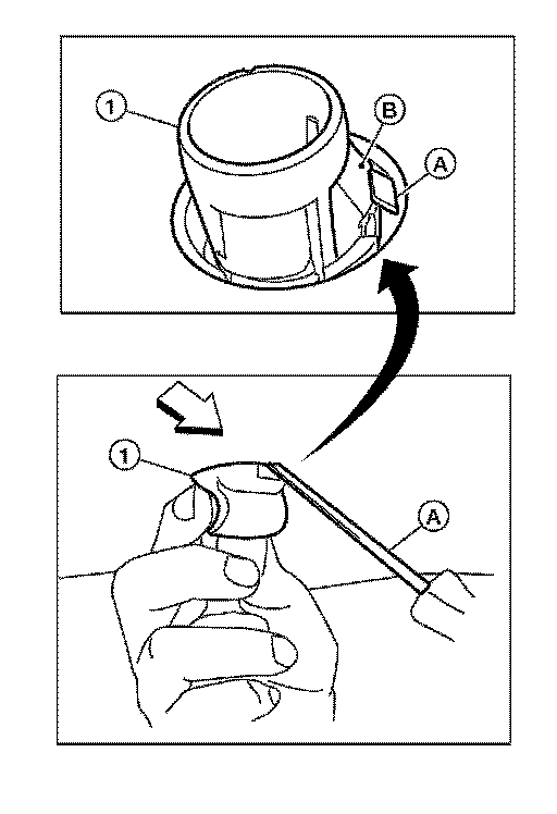 - If the sunvisor holder (1) does not fully rotate, make sure that the suitable thin tool (A) is pressing in on the locking tab (B) and is not positioned under locking tab (B). Reinsert the suitable thin tool (A) as necessary to release the locking tab (B).