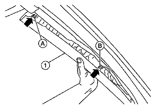 3.Align the front pillar finisher (1) lower clip (B) and upper clip (A) into their slots, then press into place, while installing the front pillar finisher (1).