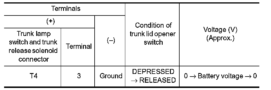 3.Check voltage between trunk lamp switch and trunk release solenoid connector and ground.