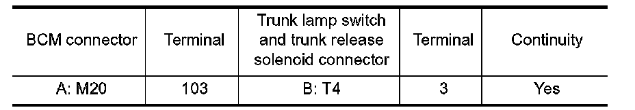 2.Check continuity between BCM connector and trunk lamp switch and trunk release solenoid connector.