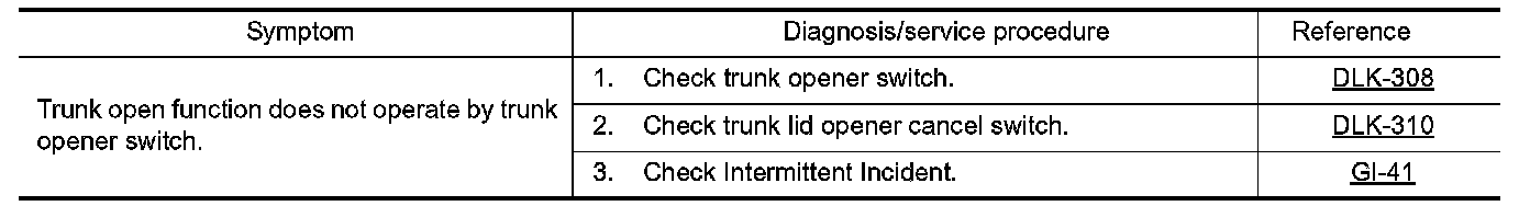 - If the following symptoms are detected, check systems shown in the "Diagnosis/service procedure" column in this order.