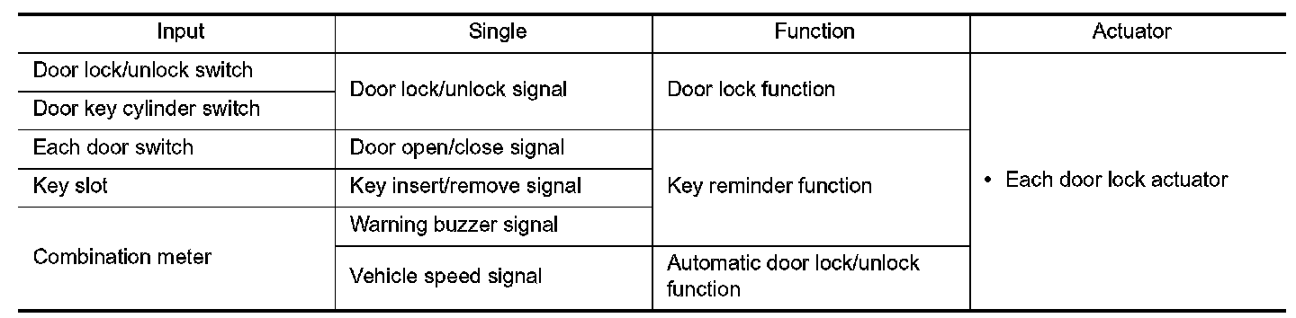 - Interlocked with the locking operation of door lock and unlock switch, door lock actuators of all doors are locked.