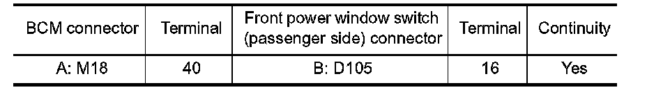 2.Check continuity between BCM connector and front power window switch (passenger side) connector.