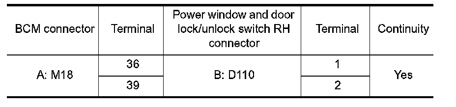2.Check continuity between BCM connector and power window and door lock/unlock switch RH connector.