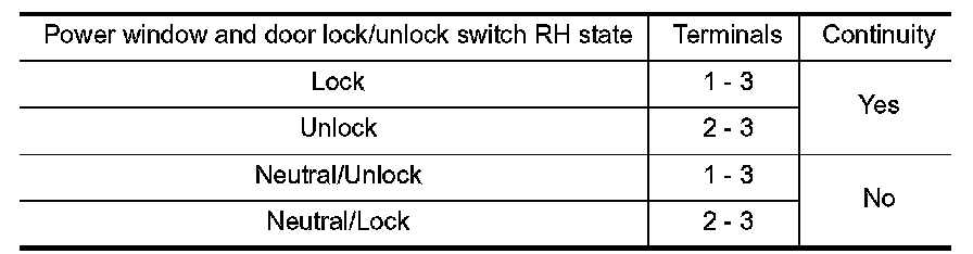 Check continuity between power window and door lock/unlock switch RH terminals.