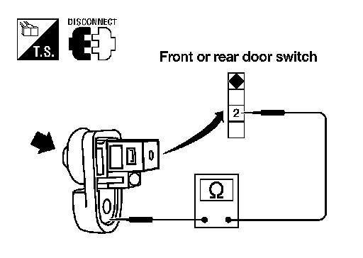 Check door switches DOOR SW-DR, DOOR SW-AS, DOOR SW-RL, DOOR SW-RR in Data Monitor mode with CONSULT.