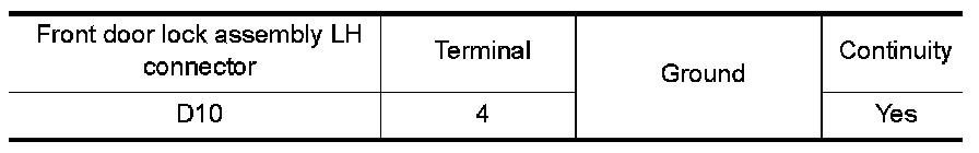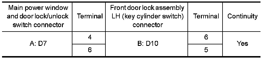 3.Check continuity between main power window and door lock/ unlock switch connector and front door lock assembly LH (key cylinder switch) connector.
