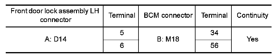 2.Check continuity between front door lock assembly LH (key cylinder switch) connector and BCM connector M18.