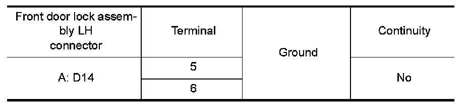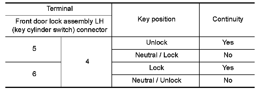 3.Check continuity between front door lock assembly LH (key cylinder switch) connector and ground.