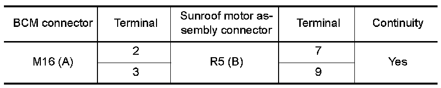 3.Check continuity between BCM connector (A) and sunroof motor assembly connector (B).