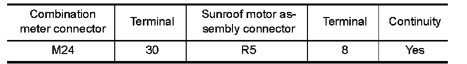 3.Check continuity between combination meter connector and sunroof motor assembly connector.