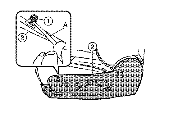 SE iii.Insert a suitable tool (A) between the seat cushion and the seat side finisher (2), then release the five metal clips. Push the finger (1) of each metal clip to release it from the seat cushion frame.