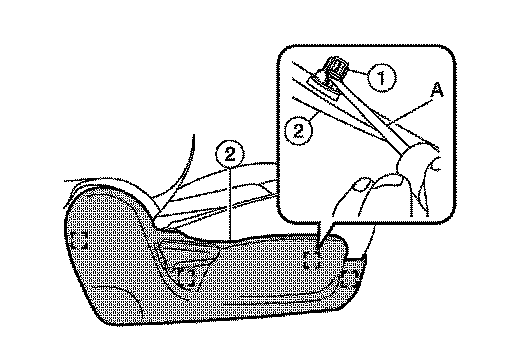 b.Insert a suitable tool (A) between the seat cushion and the seat side finisher (2), then release the four metal clips. Push the finger (1) of each metal clip to release it from the seat cushion frame.