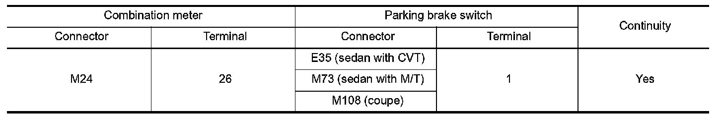 2.Check continuity between combination meter connector M24 terminal 26 and parking brake switch connector E35 (sedan with CVT), M73 (sedan with M/T) or M108 (coupe) terminal 1.